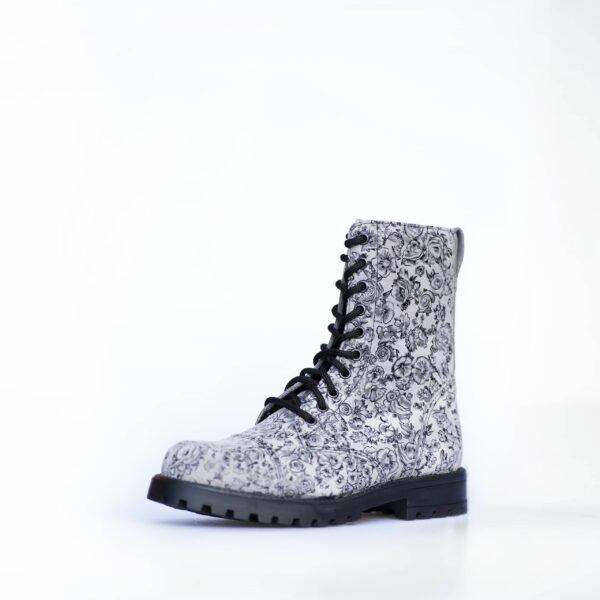 Ghete unisex piele 511 Gray Flowers din piele naturala hidrofuga cu model floral gri, stil punk, potrivite pentru purtare tot anul, inclusiv vara, datorita captuselii textile usoare.